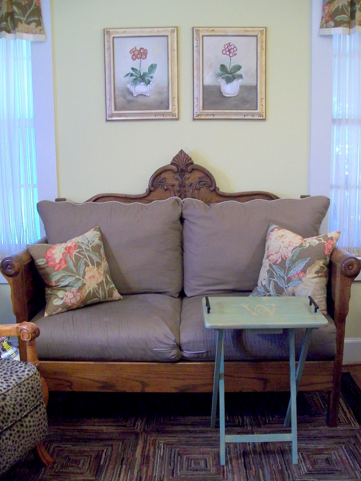 Here's the story on the loveseat from an earlier post -- the loveseat was made from a antique bed belonging to my husband. It was old and rickety and really wasn't sturdy enough to be used as a bed any longer. So, I took it apart, had the footboard cut in half (I thought I was going to throw up) and I put it all back together to make this cool loveseat. Before, the kids were drawing straws to see who was going to have to take it when we're gone...Now, they're fighting over who gets it!