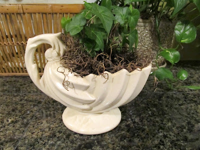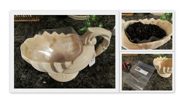 I lined the inside of the planter with a heavy duty zip lock bag cut to fit, filled it with potting soil and tucked in some ivy I rooted in my kitchen window.
